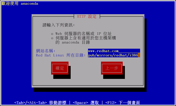 請輸入您要用來安裝之 HTTP 站台的名稱或 IP 位址,以及包含適用於您主機架構的 RedHat 安裝目錄。 舉例來說,假如該 HTTP 站台包含目錄 /mirrors/redhat/i386/RedHat,請輸入 /mirrors/redhat/i386。 假如您所輸入的資訊都正確的話,將會出現一個訊息指出正在擷取 base/hdlist 中。
