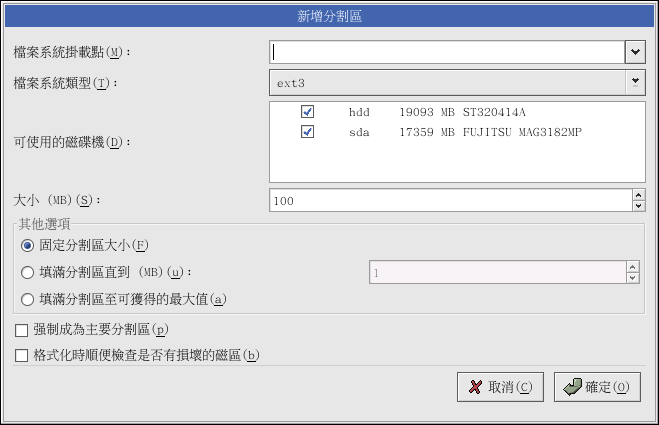 新增: 使用來要求一個新的分割區。 當選取時,會出現一個對話窗,並包含必須要填入資訊的欄位(例如,掛載點與分割區大小)。