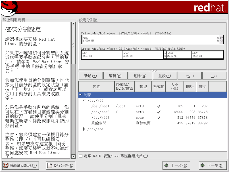 LVM: 讓您可以建立一個 LVM 邏輯磁區。 LVM (Logical Volume Manager) 的角色是是用來代表其下實體儲存空間(例如一個硬碟)的一個簡單的邏輯檢視。 LVM 管理個別的實體磁碟 — 或更明白的就是說在它們其內所含的個別分割區。 如果您有使用 LVM 的經驗,否則不建議您使用。 如需閱讀更多關於 LVM 的資訊,請參考 Red Hat Linux 用戶自訂手冊。
