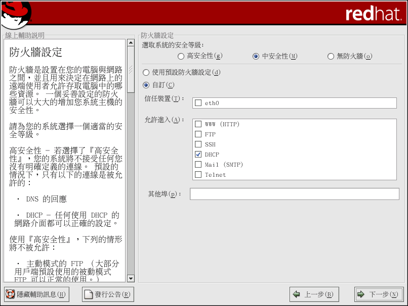 無防火牆的設定提供了完全存取您的系統,而且不做任何的安全性檢驗。 安全性檢驗就是用來停止存取某些服務。 如果您的系統在一個信任的網路環境內(非網際網路),或打算往後再設定防火牆,您才應該選擇這個選項。