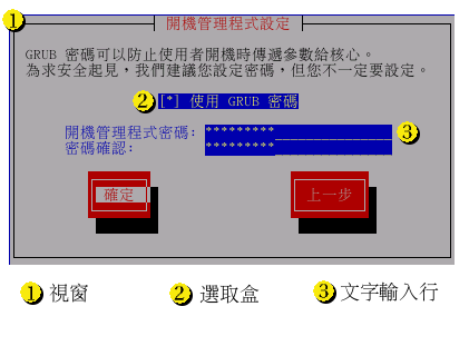 文字輸入行 — 文字輸入行是讓您可以輸入安裝程式需要訊息的地方。 當游標停留在一個文字輸入行時,您可以輸入亦或編輯在該行的資訊。