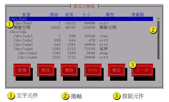 Red Hat Linux 文字模式安裝程式使用一種畫面為主的介面包含了大部分可在圖形化的使用者介面中看到的畫面『元件』(widgets)。 圖形 3-1 與 圖形 3-2 舉例說明了您將看到的畫面。