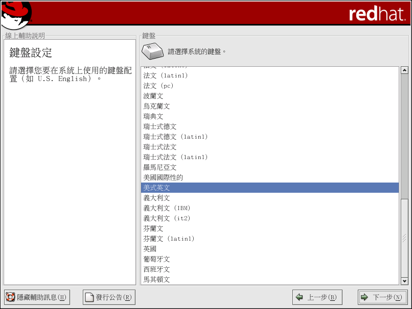 使用您的滑鼠來為您的安裝與系統預設選擇正確的按鍵配置(例如 U.S. English)(請看 圖形 3-8)。