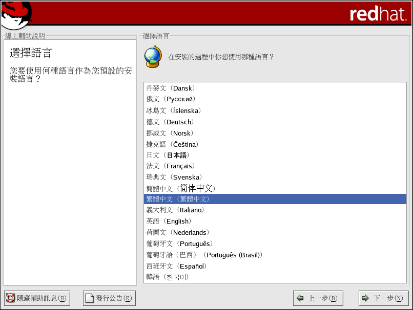 使用您的滑鼠,選擇您希望使用在安裝程式中的語言 (請看 圖形 3-7)。