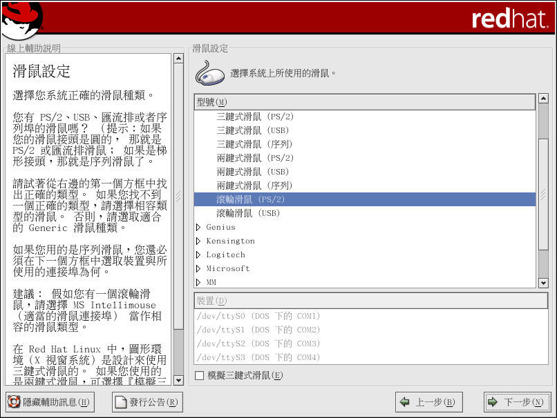 如果您有一個 PS/2、USB 或匯流排的滑鼠,您不需要選擇連接埠與裝置。 如果您有的是一個序列埠的滑鼠,您則必須要選擇滑鼠所接的正確連接埠與裝置。