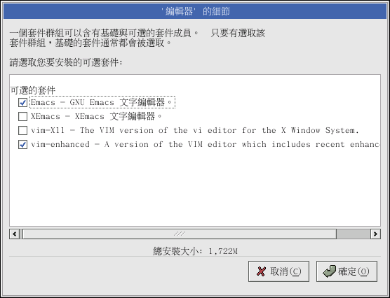 當您選取一個套件群組,可以點選 『細節』 來檢視將會安裝的預設套件,並且可以增加或移除群組中的可選套件。