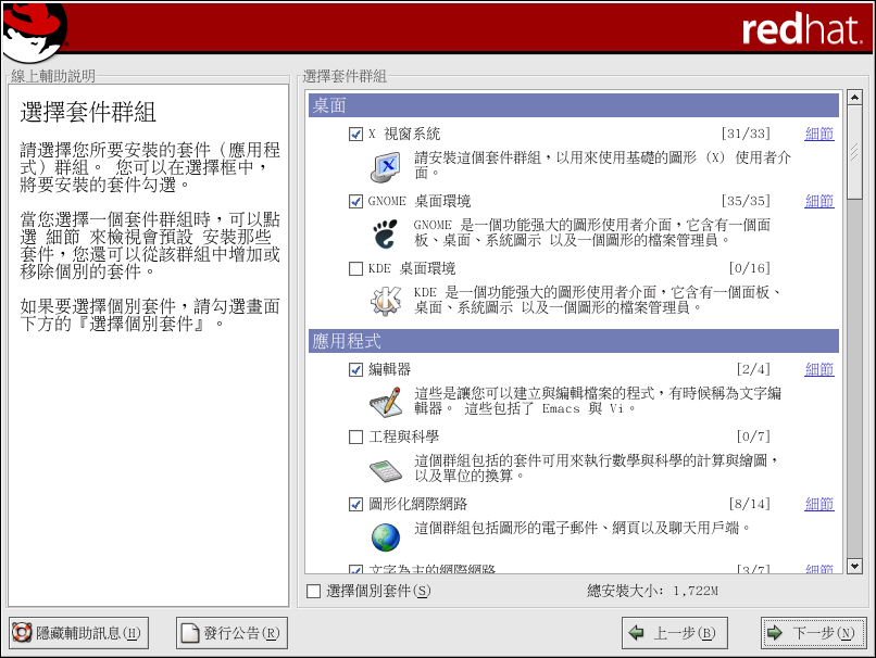 選擇您想安裝的每一個套件群組。 在自訂安裝的過程中,選擇 『全部安裝』 (在套件群組清單的最後)將會安裝收錄在 Red Hat Linux 中的所有套件。