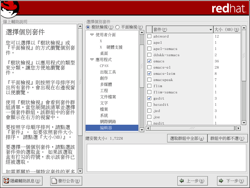在此您可以選擇套件群組(根據功能性將套件群組起來,例如 『X 視窗系統』 與 『編輯器』)、個別套件或者是兩者的結合。