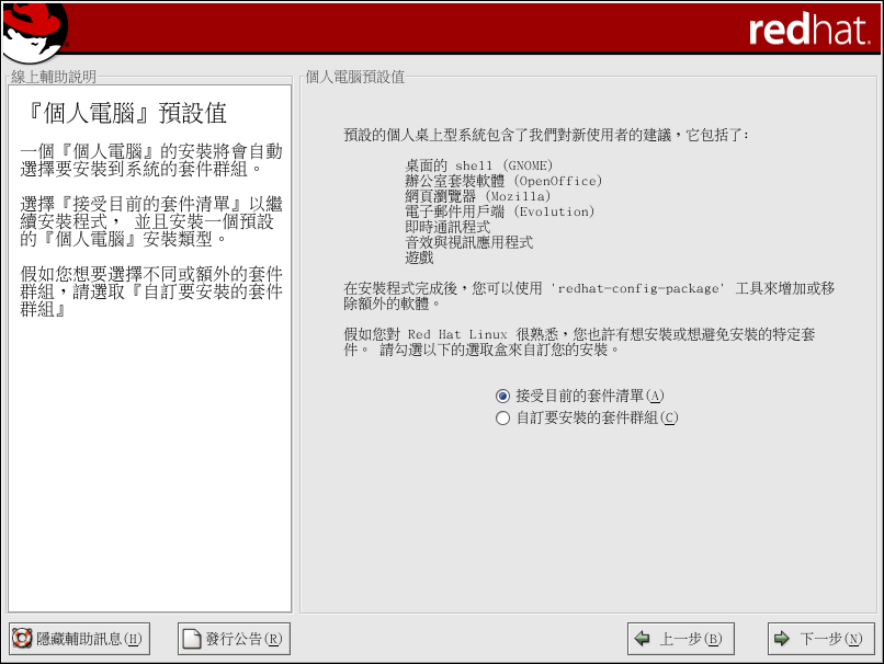 舉例來說,假如您要執行一個『個人電腦』的安裝,您也許會看到如下的畫面: