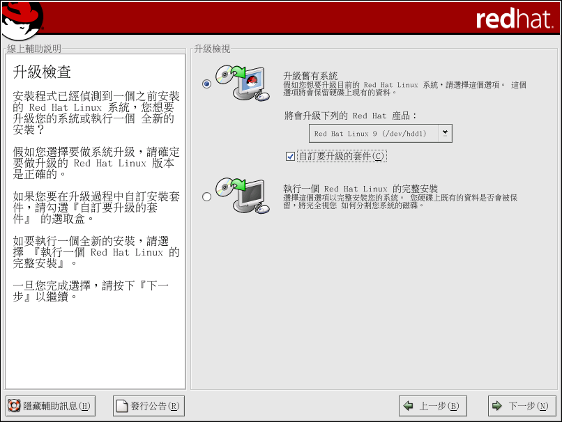 假如安裝程式偵測到系統上有一個之前版本的 Red Hat Linux,將會自動出現 『升級檢查』 的畫面。