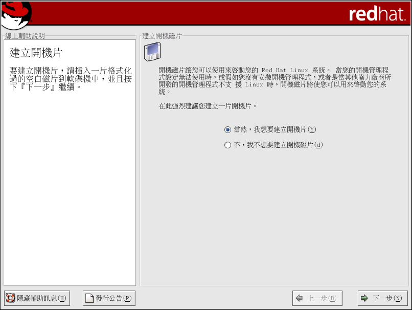 在此強烈建議您建立一片開機磁片。 如果因為某種因素,您的系統無法使用 GRUB、LILO 或其他協力廠商的開機管理程式來正確啟動,這個開機磁片會讓您妥善地啟動您的 Red Hat Linux 系統。
