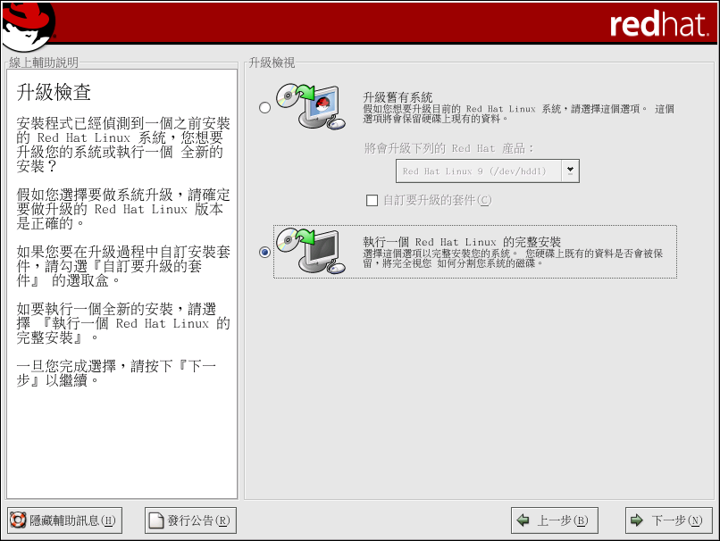 假如安裝程式偵測到您的系統上有一個之前版本的 Red Hat Linux,將會自動出現 『升級檢查』 的畫面。