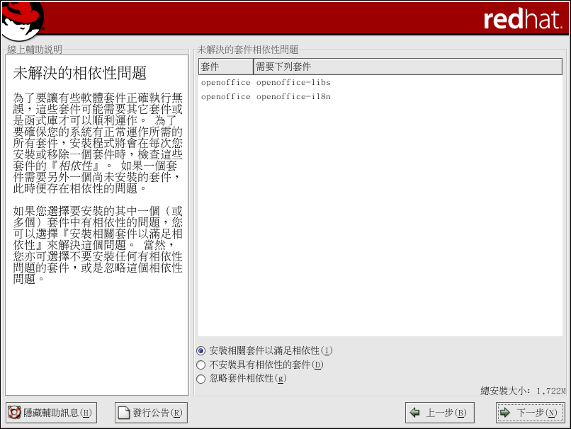 假如有任何套件需要其他您沒有選取要安裝的套件,程式就會列出這些 『未解決的套件相依性問題』,並讓您有機會來解決它們 (請看 圖形 A-6)。