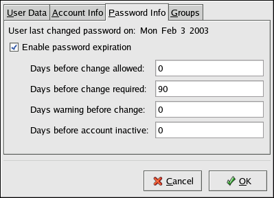 Then click the Password Info tab and enter the number of days before the password expires, as shown in Figure 4-1.