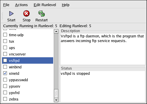 Red Hat Linux ships with three programs designed to switch services on or off. They are the Services Configuration Tool (redhat-config-services), ntsysv, and chkconfig. For information on using these tools, see the chapter titled Controlling Access to Services in the Red Hat Linux Customization Guide.